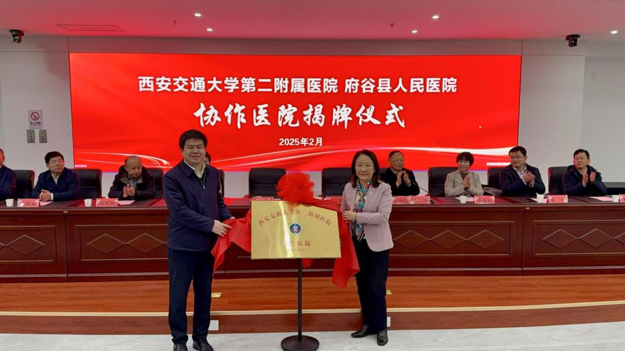 2025年2月12日上午,西安交通大学第二附属医院与府谷县人民医院的协作医院揭牌仪式在府谷县人民医院隆重举行。西安交通大学第二附属医院党委书记刘昌、副书记党变玲、副院长戴一,以及榆林市副市长兼府谷县委书记田小宁、榆林市卫生健康委员会副主任焦明辉、县人大常委会主任杨艾霞、县政协主席尚建林、县长武静、副县长陈昊、县医院院长杨斌等领导成员及西安交通大学第二附属医院专家团队一行出席了此次活动,县长武静主持活动。