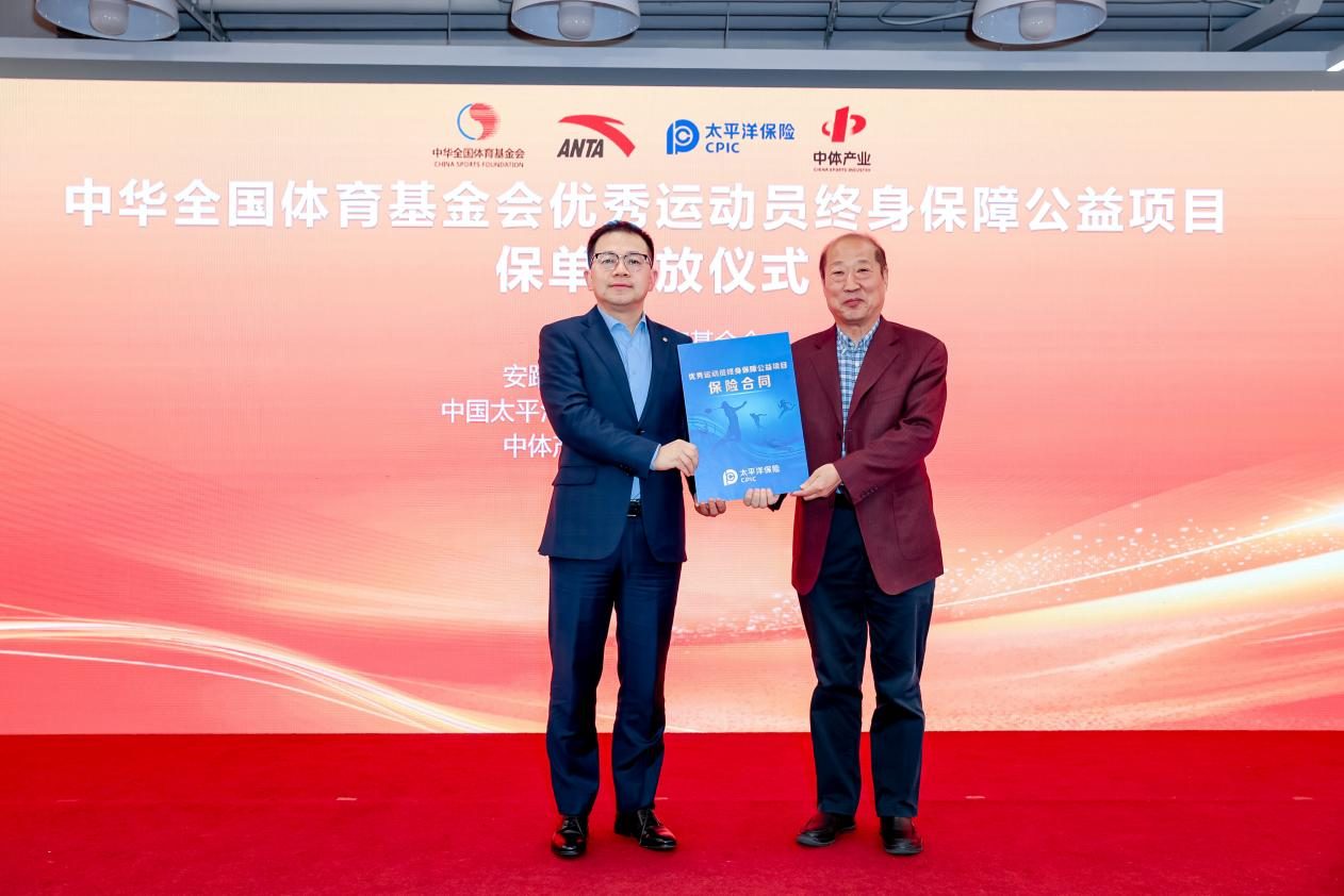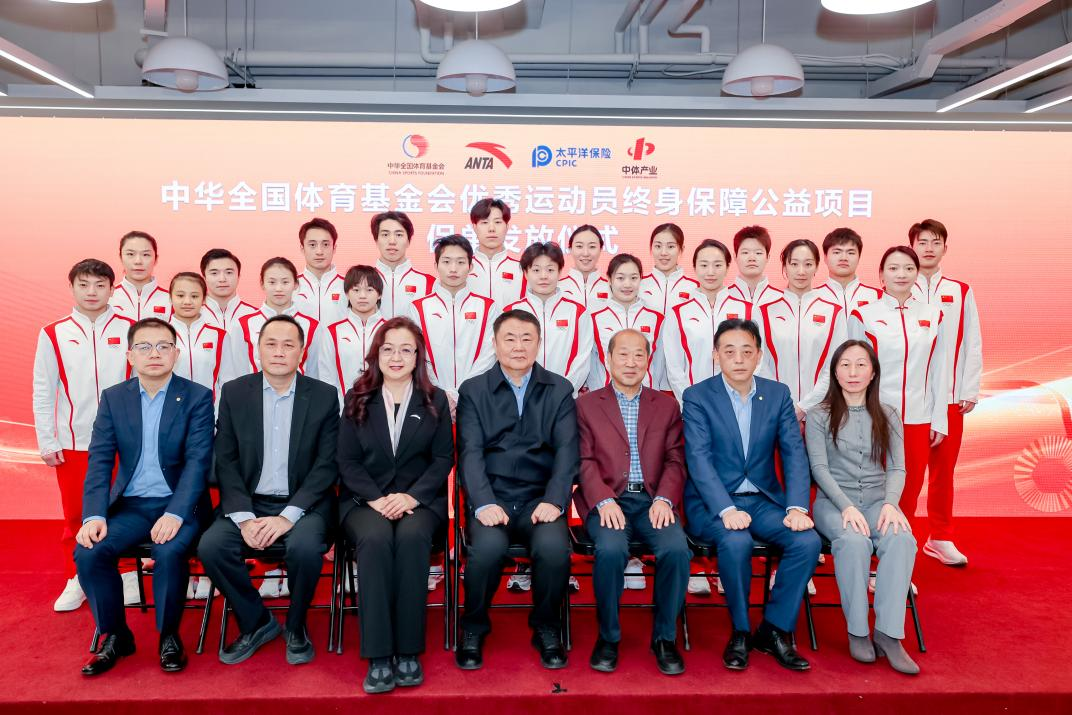 中华全国体育基金会理事长王卫东,中华全国体育基金会副理事长、秘书长彭维勇,中国太保副总裁俞斌,安踏集团副总裁李玲,中体产业集团副董事长、总裁陈世虎向现场运动员发放保单凭证。这标志着以商业保险为运动员提供终身养老保障模式正式落地,开启了商业保险助力体育强国建设的新篇章。