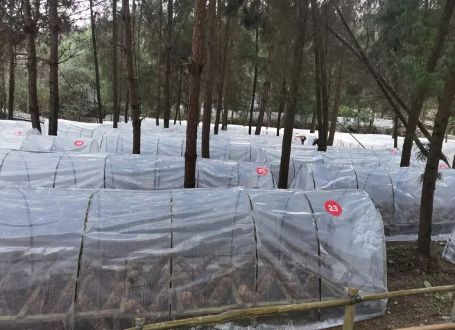 不远处,基地负责人朱忠坤掀开塑料薄膜,一根根菌棒上探出的灰褐色“小伞”簇拥成团,让他忍不住笑出了声:“这批菌子长势稳了!”