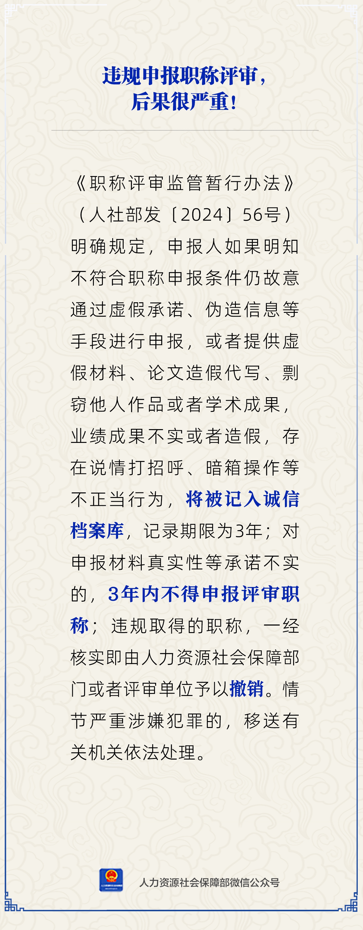 据人力资源和社会保障部微信公众号消息,违规申报职称评审,会有怎么样的后果?就这一问题,人力资源和社会保障部回应称,《职称评审监管暂行办法》(人社部发[2024]56号)明确规定,申报人如果明知不符合职称申报条件仍故意通过虚假承诺、伪造信息等手段进行申报,或者提供虚假材料、论文造假代写、剽窃他人作品或者学术成果,业绩成果不实或者造假,存在说情打招呼、暗箱操作等不正当行为,将被记入诚信档案库,记录期限为3年;对申报材料真实性等承诺不实的,3年内不得申报评审职称;违规取得的职称,一经核实即由人力资源社会保障部门或者评审单位予以撤销。情节严重涉嫌犯罪的,移送有关机关依法处理。