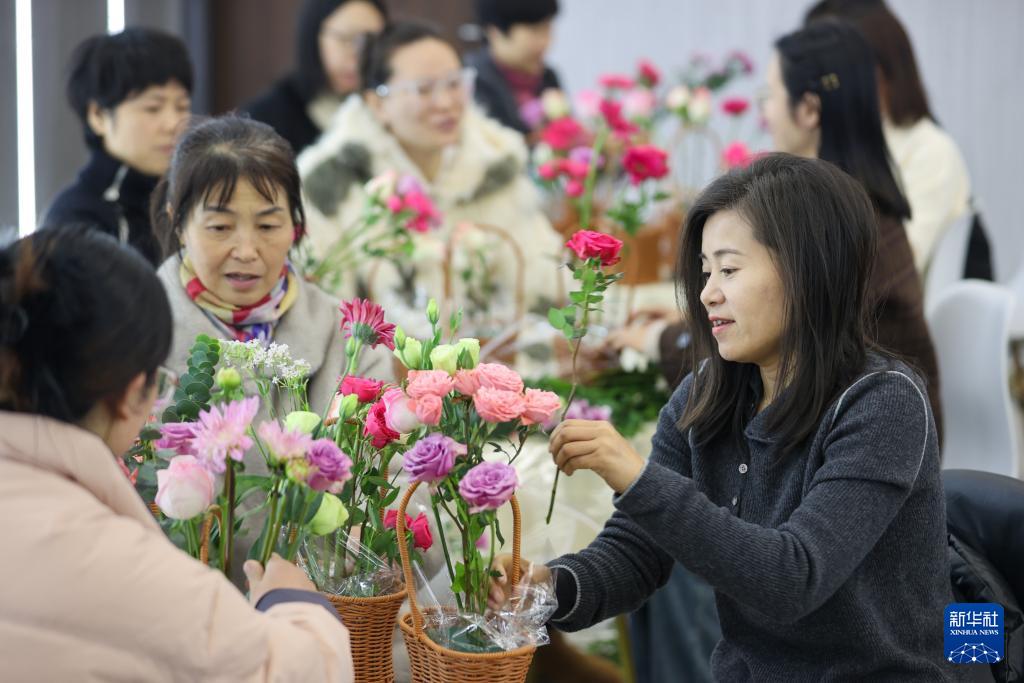 3月5日,在浙江省湖州市埭溪镇成人文化技术学校举办的“迎三八”主题活动上,妇女们在学习插花。