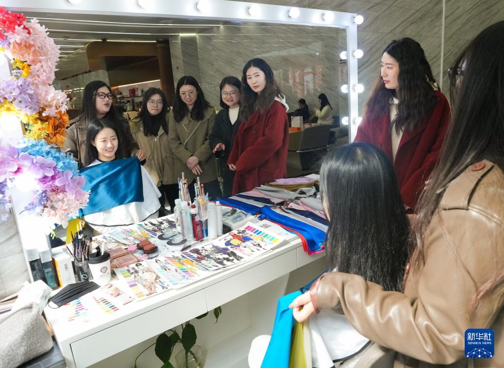 3月6日,一名女子在色彩测试课堂获得专属设计体验。当日,浙江省湖州市美妆小镇开启美好生活节,设置美妆课堂、香氛展览、美妆购物等活动,吸引众多女性观众前来参加。