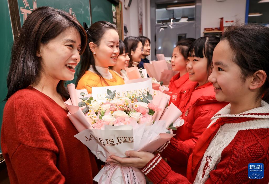 3月6日,湖北省武汉市未来实验美林小学学生为女教师献上鲜花。