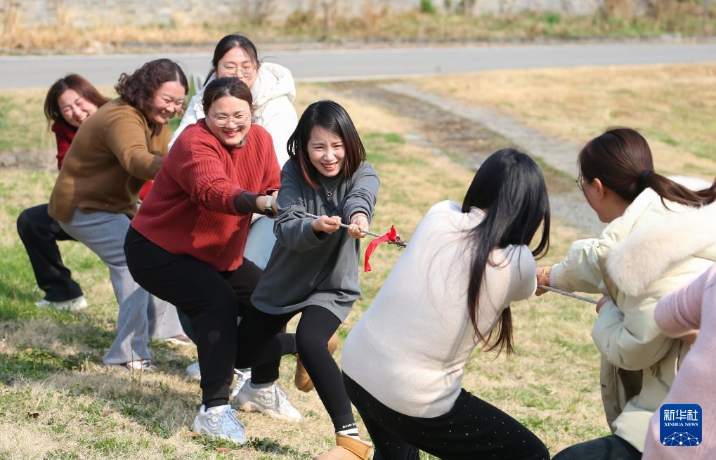 3月6日,在江苏省句容市崇明街道甲城社区迎“三八”活动中,妇女们在进行拔河比赛。