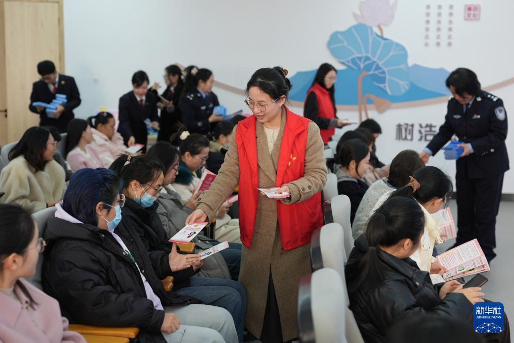 3月6日,在浙江省湖州市吴兴区月河街道浮星桥社区,工作人员向女性居民发放相关法律宣传单,以普法宣传的方式维护妇女权益。