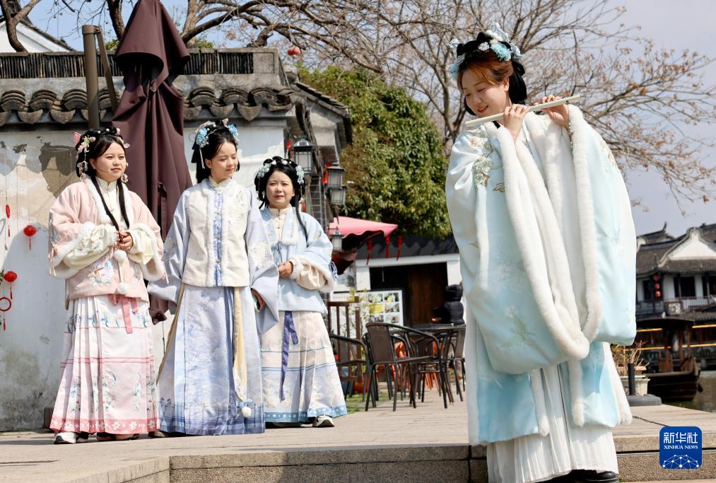 3月6日,中建二局中山医院青浦新城院区项目部女职工在上海朱家角古镇拍汉服照。