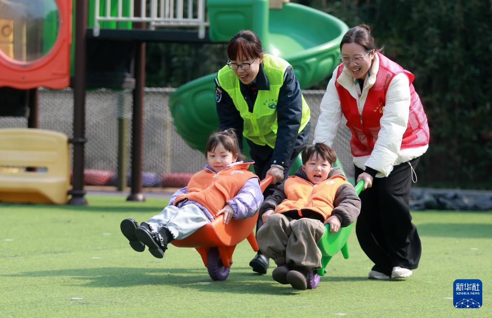 3月6日,江苏省扬州市公交集团四分公司与江苏省扬州市邗江区一所幼儿园联合开展趣味运动迎“三八”活动,扬州市公交集团四分公司的志愿者和孩子们一起做趣味游戏。