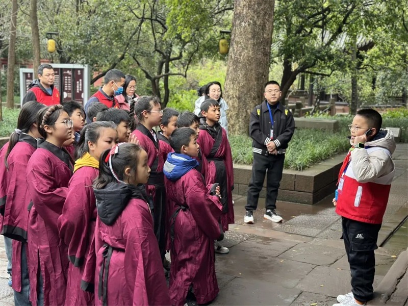 研学首站,孩子们在三苏祠通过正衣冠、击鼓明志等传统礼仪开启文化溯源。在专业讲解员与"小小讲解员"双导师引领下,研读碑刻文献、瞻仰三苏遗迹,深度领悟"读书正业、孝慈仁爱"的家风精髓。第二站走进老坛子非遗基地,孩子们沉浸式体验泡菜选材、腌制全过程,亲身感受千年非遗技艺的温度与智慧,在劳动实践中增强本土文化自信。