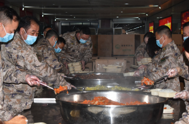 蒸腾的水汽裹挟着油盐酱醋的香气在操作间氤氲,刀刃与砧板碰撞的节奏声里,数名工作人员在黎明前的微光中开始了一天的忙碌,只为让即将远行的子弟兵带上家乡的温度。