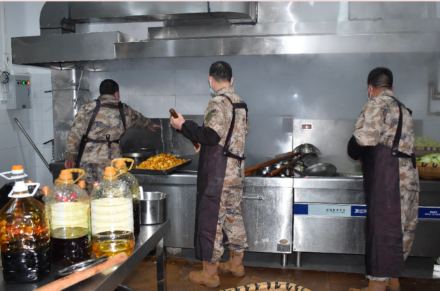 “为了让新兵们吃上热乎饭菜,我们凌晨五点就到了。”后厨师傅们弓着腰,认真地备着菜。3月17日早上九点刚过,饭菜基本上已经出锅,一盆又一盆地被抬上桌面。只见一个个空饭盒在不同官兵手中流转,不到一分钟便盛满了色香味俱全的饭菜。