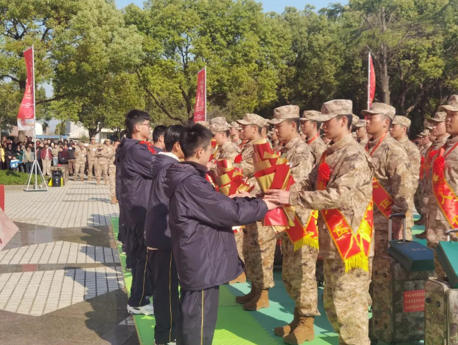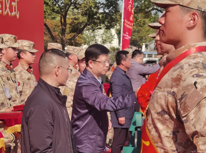 欢送会上锣鼓喧天,京剧《穆桂英挂帅》、诗朗诵《穿上军装去当兵》等表演缤纷呈现。全体新兵身着崭新军装,区领导为他们颁发入伍通知书、佩戴大红花,还送上融入嘉定特色的“强军有我”纪念章。
