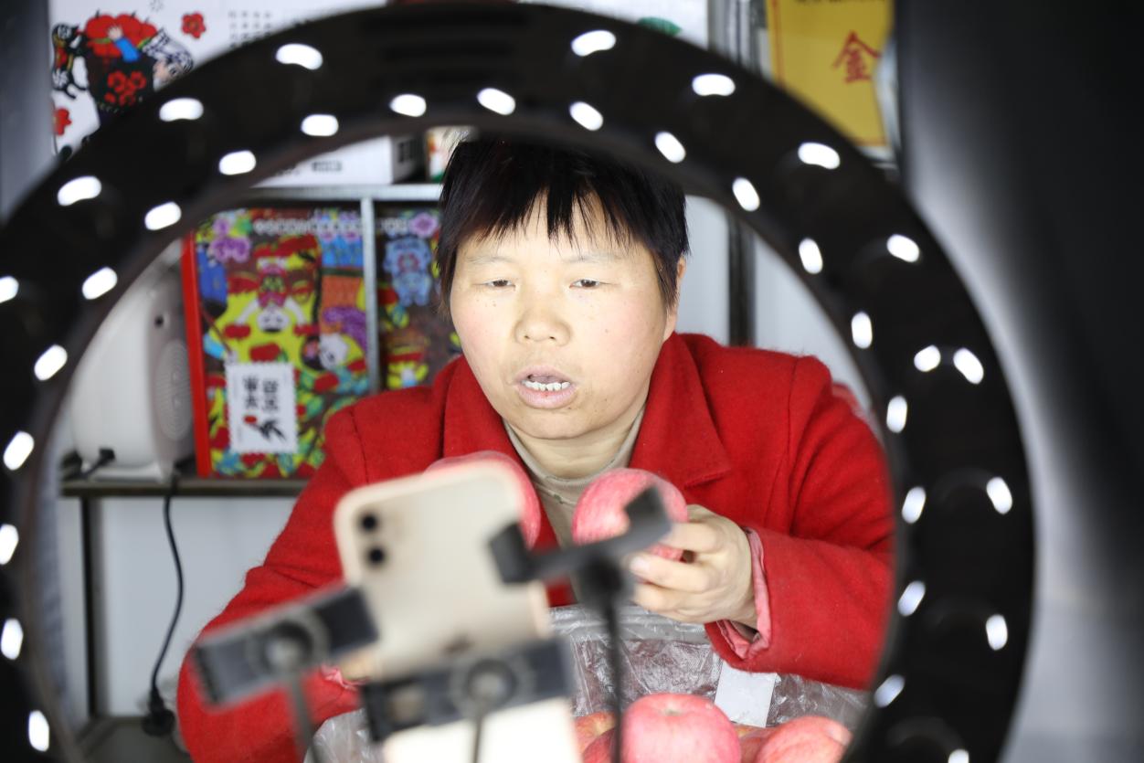 果农李亚丽家中,她正通过抖音直播售卖苹果。李亚丽家有40亩果园,还有一个能存放50吨苹果的小冷库。“有了苹果产销服务基地的大冷库兜底,苹果再多也有地方存了。”李亚丽说。据悉,基地冷藏库为电商直播户错峰销售提供了存储服务。