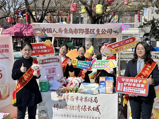 近日,中国人寿青岛市分公司即墨区支公司(以下简称:即墨国寿)参加在即墨古城县衙举行的“2025即墨区金融消保传统文化游园会”活动。活动中即墨国寿积极组织参与,通过趣味化形式助力金融知识普及。