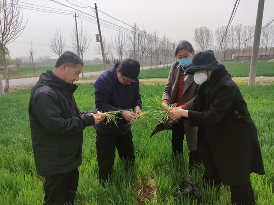 近日,针对枣庄市薛城区邹坞镇年前旺长麦田部分大蘖冻死的情况,枣庄市薛城区邹坞镇农技站督促农户尽早浇水追肥,促进小蘖成穗以确保高产稳产。(周红伟 褚福伟 刘玮)