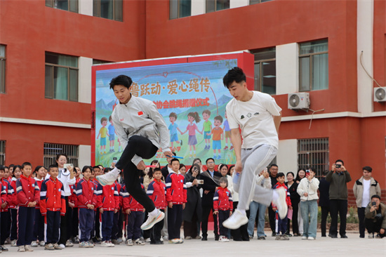 仪式上,山东师范大学联合山东省跳绳运动协会向疏勒县第四小学赠送了200根跳绳,并协助编创特色绳操,学校负责人接受捐赠并向捐赠方颁发证书表达谢意。随后,精彩的跳绳表演赢得了师生的阵阵掌声。学生代表也发出倡议,呼吁全体同学积极参与跳绳运动,强健体魄、培养团队精神。