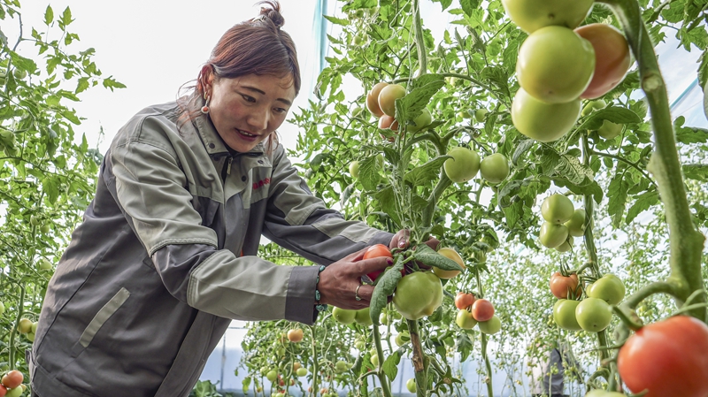 2024年11月22日,在西藏昌都市丁青县农业生态产业园,工作人员在采摘西红柿。近年来,园区通过“政府+企业+科研机构+合作社+农户”的经营管理模式,为农牧民群众提供免费技术培训以及工作岗位,有力带动当地群众增收致富。新华社记者 格桑朗杰 摄