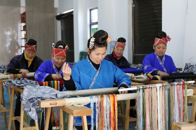 2024年12月16日,在贵州省黔东南苗族侗族自治州施秉县城关镇易地扶贫搬迁南官营社区一家苗绣企业生产车间,入职的社区居民在赶制订单产品。南官营社区是该县脱贫攻坚期间实施规划建设的精准扶贫易地搬迁社区。新华社发(邰胜智 摄)