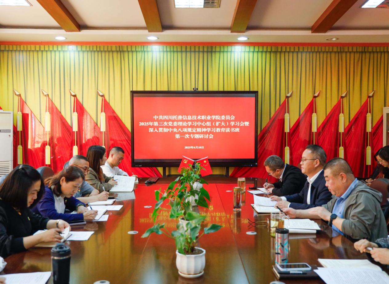 4月10日,四川托普信息技术职业学院召开2025年第三次党委理论学习中心组(扩大)学习会暨深入贯彻中央八项规定精神学习教育读书班第一次专题研讨会。学校党委书记沈邦兵主持会议并讲话。