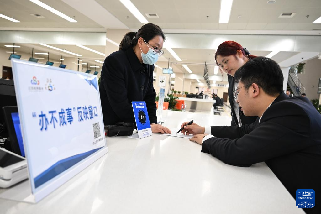 4月14日,在淮安市洪泽区政务服务中心,洪泽区纪委监委工作人员(左一、右一)了解群众满意度。当地纪委开展“正风提效 真抓实干”专项行动,推动窗口单位进一步以“好作风”提供“好服务”。新华社记者 季春鹏 摄
