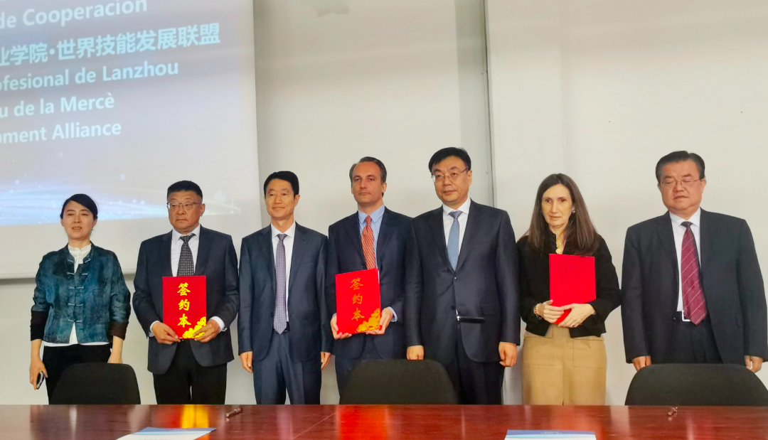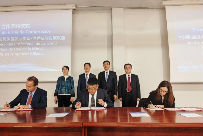 兰州职业技术学院副院长范宏伟、世界技能发展联盟主席奥斯卡·范·蒂尔、拉梅尔塞职业学院校长卢尔德斯·冈萨雷斯分别代表合作方签约。