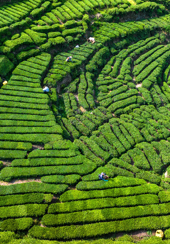 4月20日,茶农在浙江省湖州市吴兴区埭溪镇东红村采摘春茶(无人机照片)。