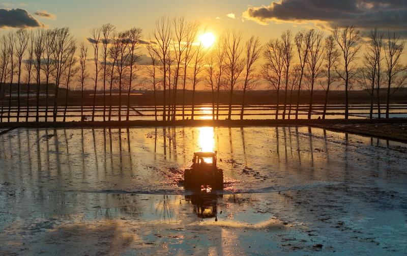 4月20日,在黑龙江省富锦市锦山镇财源村,种植户驾驶农机进行打浆作业(无人机照片)。