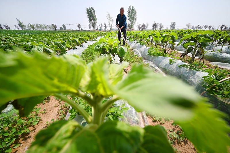 4月20日,河南省开封市祥符区范村乡百亩岗村农民在葵花地除草。