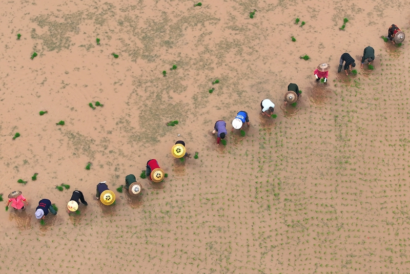 4月20日,在湖南省衡阳市祁东县金桥镇,当地村民在进行早稻插秧作业(无人机照片)。