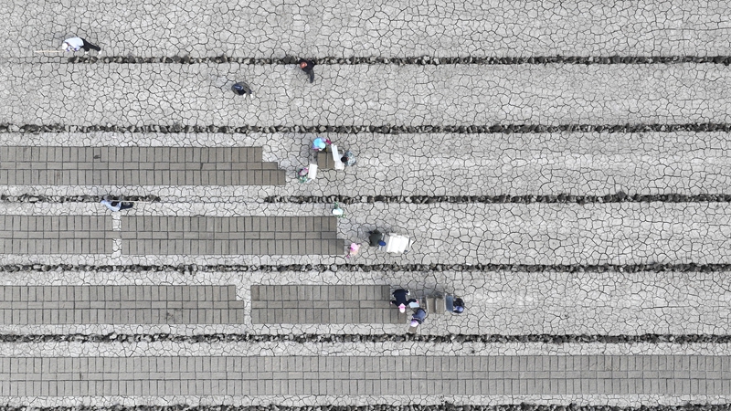 4月20日,在河北省唐山市丰南区西葛镇越支六村,农民在田间开展水稻育秧工作(无人机照片)。