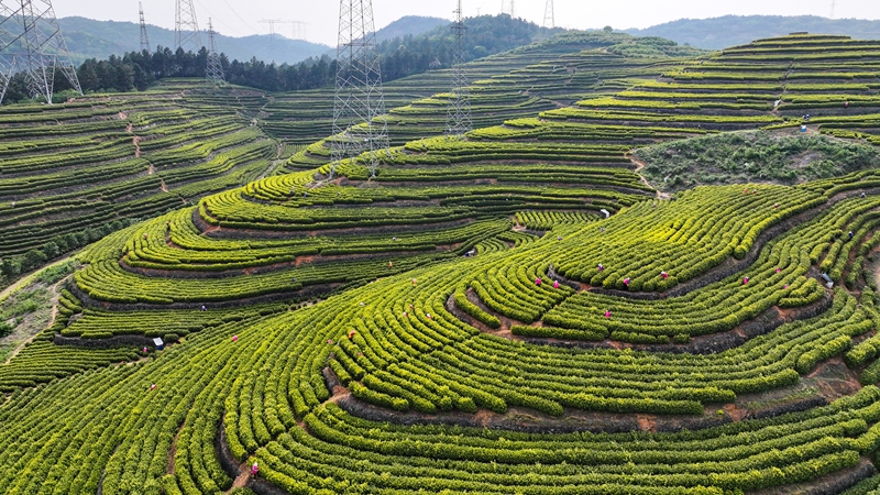 4月20日,湖北省宜昌市秭归县茅坪镇长岭村的村民在茶园采茶(无人机照片)。
