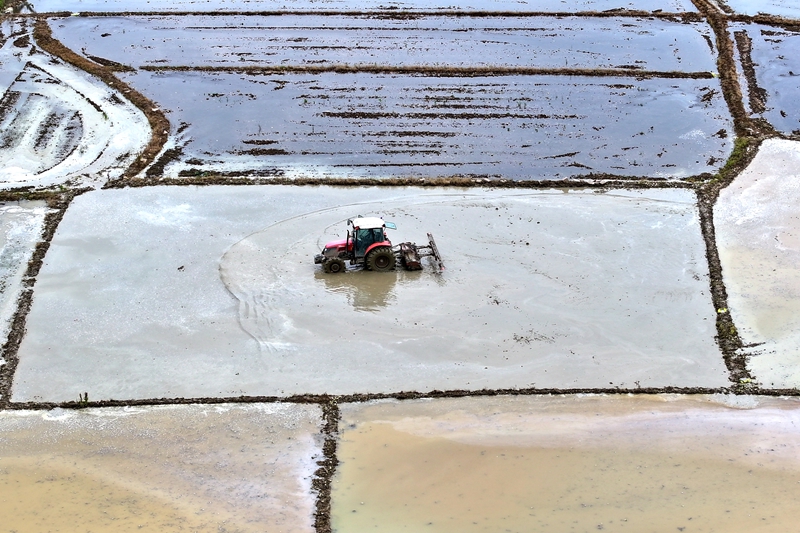 4月20日,在福州市长乐区江田镇青下龙村,农民驾驶农机翻整田地(无人机照片)。