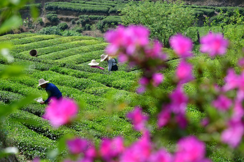 4月20日,茶农在湖北省宜昌市秭归县茅坪镇长岭村一家茶园采摘谷雨茶。