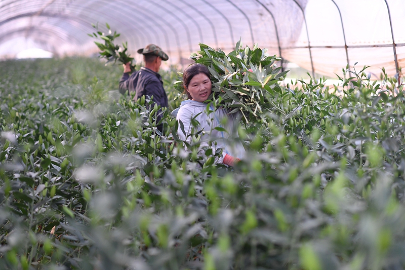 4月20日,在云南省文山壮族苗族自治州文山市马塘镇花卉种植基地,花农在管理、采收百合花。