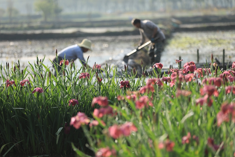 4月20日,在云南省腾冲市和顺镇大庄社区香藕园,农民在荷塘里加固堤坝。