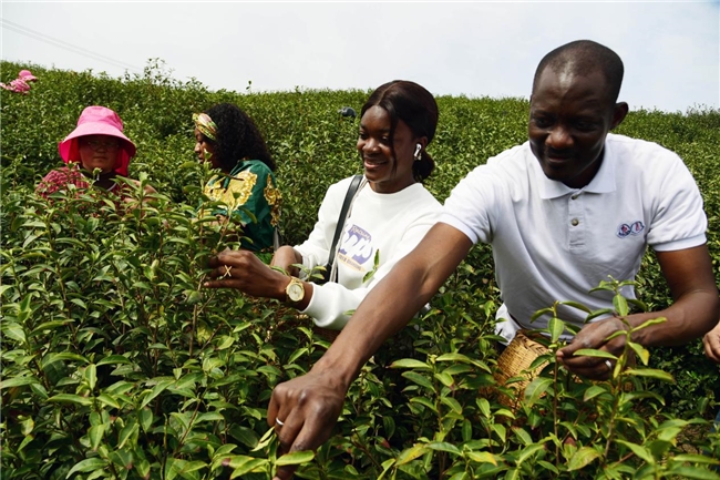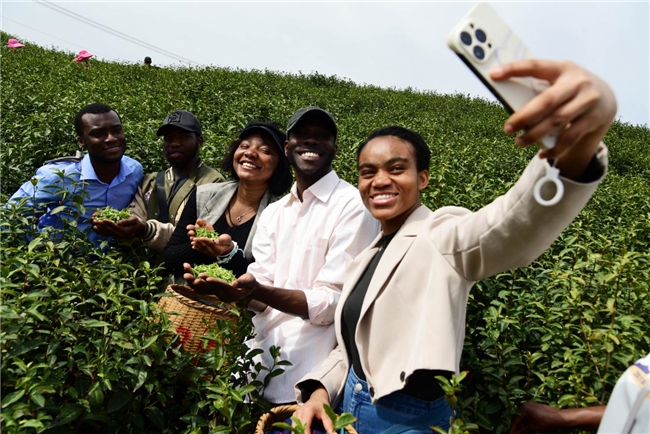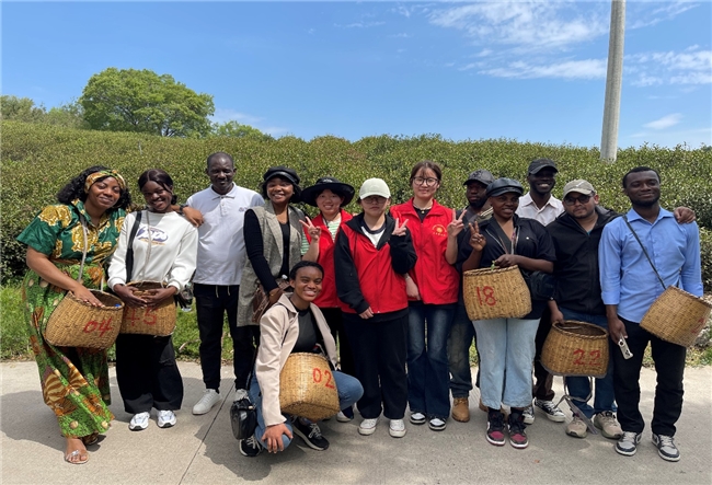 采茶结束后,大家与茶农积极交流。茶农分享了当地茶叶种植的历史与特色,留学生们则好奇地询问茶叶的生长周期和加工工艺,现场气氛热烈,欢声笑语不断。
