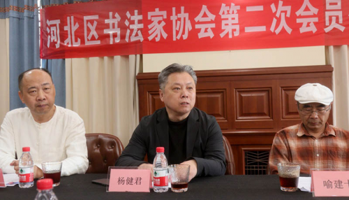 中国书协理事,天津市书法家协会副主席兼秘书长杨健君代表市书法家协会讲话。他对过去一届区书协的工作给予了充分肯定,对新一届区书协领导班子充分信任,对书协未来的发展充满信心,希望在新一届班子的带领下,河北区书协要进一步发现培养人才,多出艺术精品,团结协作,德艺双馨,建好广大书法艺术家的“精神家园”。