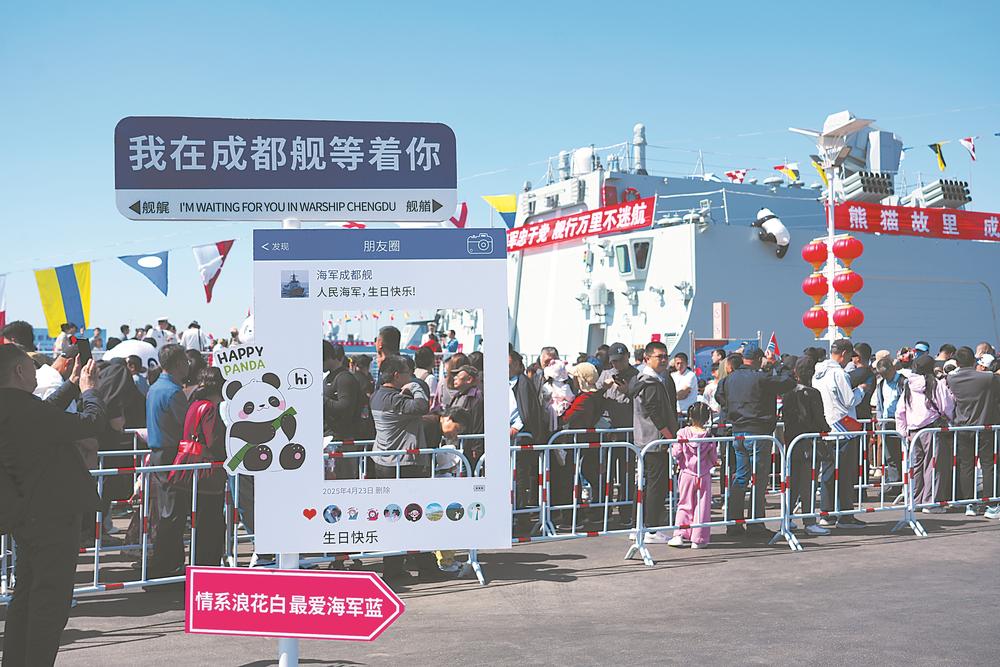 “看到网上的预约信息马上约了,带着孩子来看看,孩子特别喜欢军舰。”来自淄博的陈女士一大早带着孩子来到青岛奥帆中心,排队等待上舰参观。4月23日是人民海军成立76周年纪念日,也是海军成都舰2019年入列以来首次对公众开放,预约成功的游客纷纷前来参观,在打卡点拍照留念。
