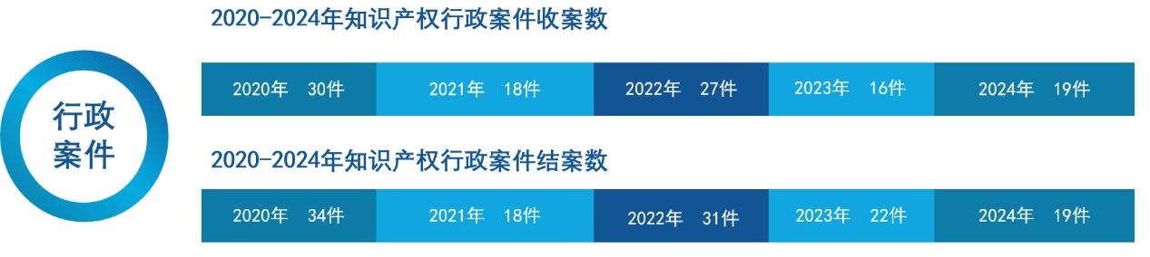 2024年,山东法院新收知识产权行政案件20件,同比增长25%;审结20件,同比下降9.09%。新收知识产权行政一审案件19件,同比增长18.75%;其中,商标案件6件,专利案件13件。审结19件,同比下降13.64%。