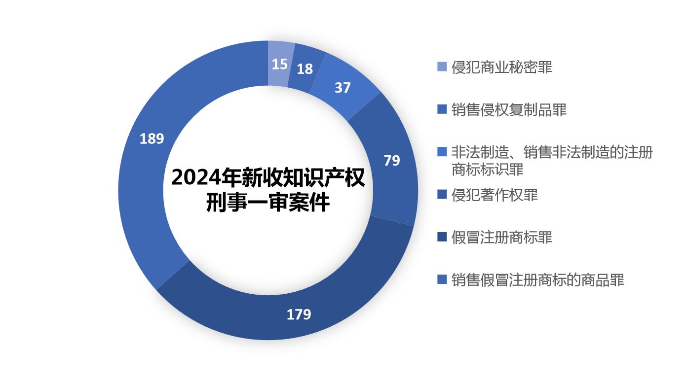 2024年,山东法院新收知识产权刑事案件590件,同比增长29.67%;审结574件,同比增长36.67%。新收知识产权刑事一审案件517件,同比增长34.29%;其中,新收假冒注册商标罪案件179件,销售假冒注册商标的商品罪案件189件,非法制造、销售非法制造的注册商标标识罪案件37件,侵犯著作权罪案件79件,侵犯商业秘密罪案件15件,销售侵权复制品罪案件18件。审结513件,同比增长48.27%。
