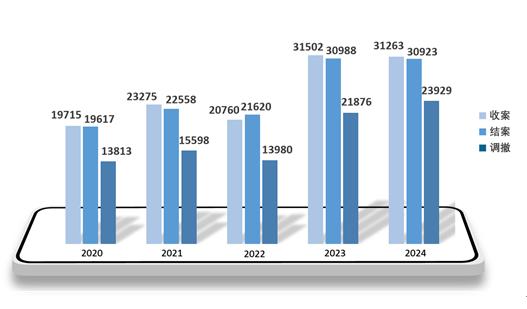 2024年,山东法院新收知识产权民事案件33116件,同比下降1.17%;审结32866件,同比下降1.07%。新收知识产权民事一审案件31263件,同比下降0.76%;其中,新收专利案件1752件,商标案件8524件,著作权案件17503件,不正当竞争案件996件,植物新品种案件145件。审结知识产权民事一审案件30923件,同比下降0.21%;其中,知识产权民事一审案件调撤23929件,调撤率为77.38%,同比增长6.78个百分点。知识产权民事案件收案呈下降趋势,调撤率同比显著提升,多元解纷效能持续释放,源头治理效果持续增强。