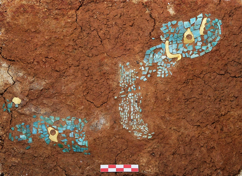 湖北黄陂盘龙城遗址杨家湾M17出土的金片绿松石镶嵌饰(资料照片)。