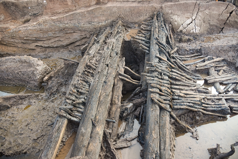 云南晋宁河泊所遗址出土的大型木构遗迹(资料照片)。