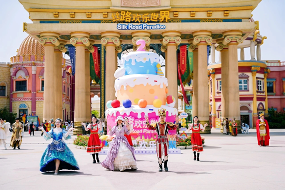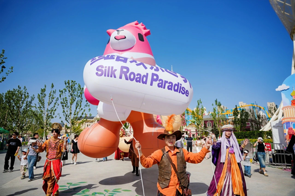丝路欢乐世界举办第二届丝路文化艺术节,欧洲五国艺术团热舞、非遗民乐与赛博朋克融合、创新游乐设备吸引年轻群体。5月1日,爱之塔首次开放,无人机表演惊艳众人。