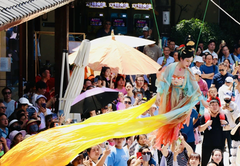 诗经里景区则通过非遗民俗、民乐演出让游客感受传统风雅。各处布置的大型气模让游客沉浸式感受诗经文化独特魅力;飞天舞者在空中展现优美舞姿,洒下祈愿红包,红包内不仅有惊喜现金,更有代金券、餐饮优惠券等,引得全场人声鼎沸。在这里,每天50场不重样的精彩演出,让周朝雅乐和街头艺术完美碰撞。