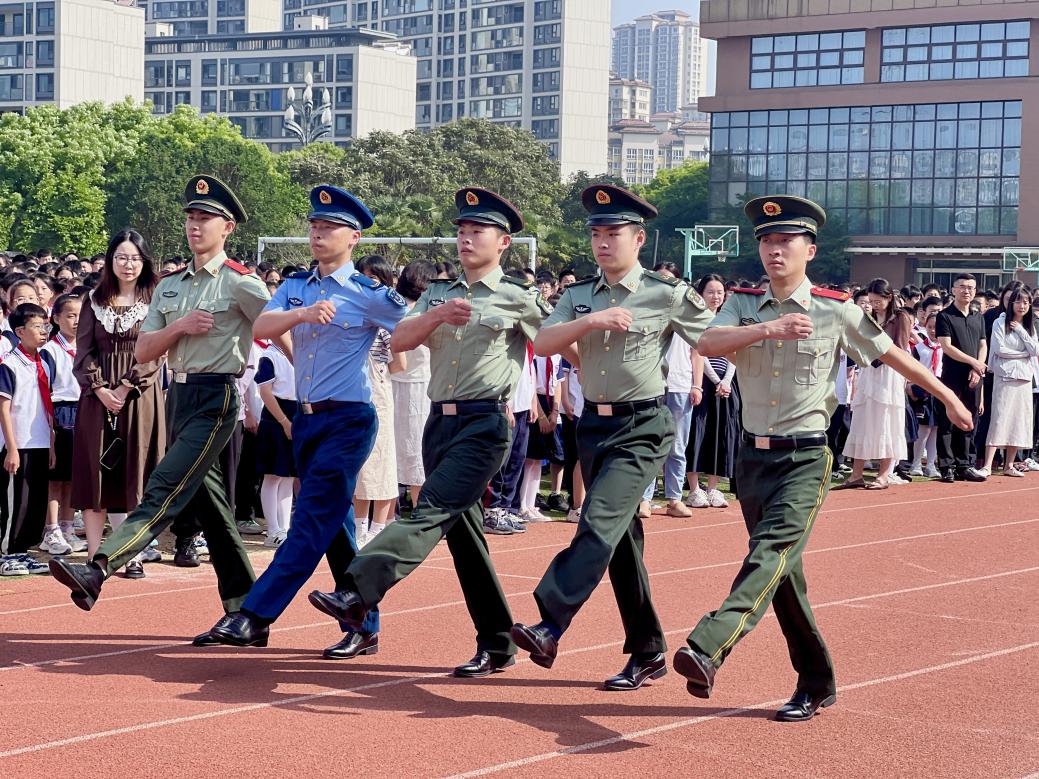 清晨,全校师生齐聚操场,德积、后塍街道退役军人迈着铿锵有力的步伐护送国旗入场。国歌奏响,五星红旗冉冉升起,师生庄严肃立,高唱国歌、行注目礼,爱国强军的信念在学生心中扎根。