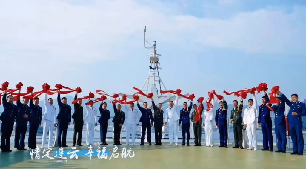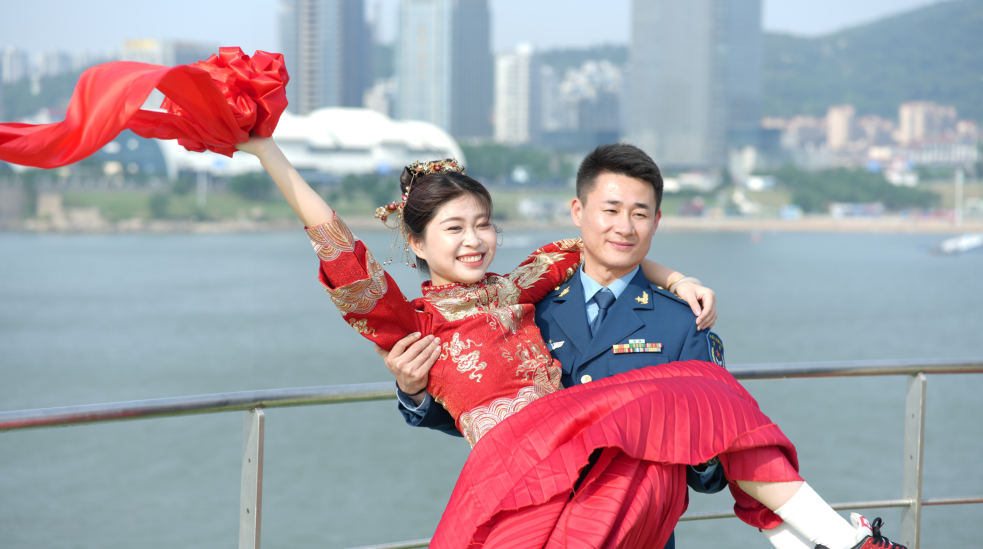 在《婚礼进行曲》和《强军战歌》的旋律中,新人们携手走过红毯,在亲友和战友的见证下,面向军旗庄严宣誓。随后,新人们乘坐“海州湾之星”游船,前往“连云爱情街区小镇”“山海同心”主题打卡点,拍摄“戎装+红妆”的婚礼纪念照,定格下属于军人军属的永恒浪漫。