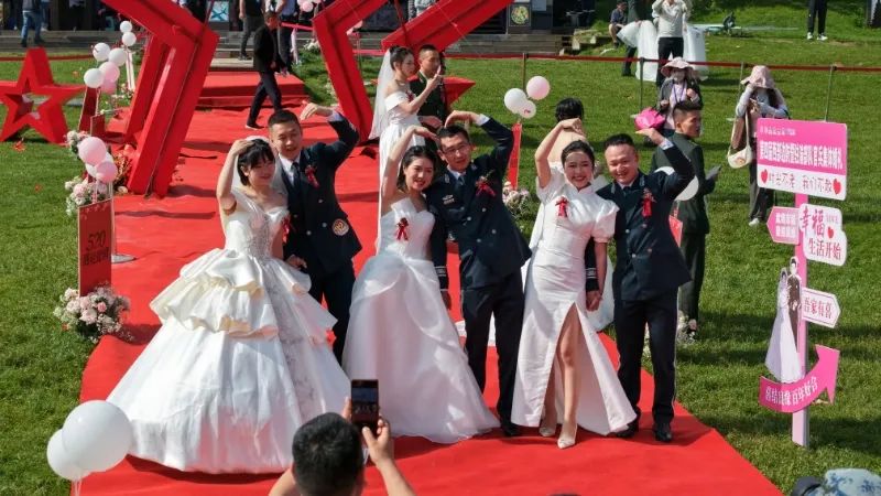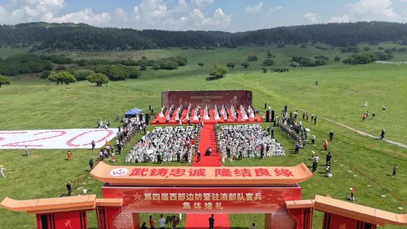 同沐风雨、共筑家国, 左手牵你、右手敬礼。5月20日,第四届西部边防暨驻渝部队官兵集体婚礼系列活动在重庆武隆仙女山举行。来自西部边防和驻渝部队各兵种、各岗位官兵及其爱人,在亲友、军地领导和群众共同见证下,开启一场戎装与婚纱的甜蜜邂逅。