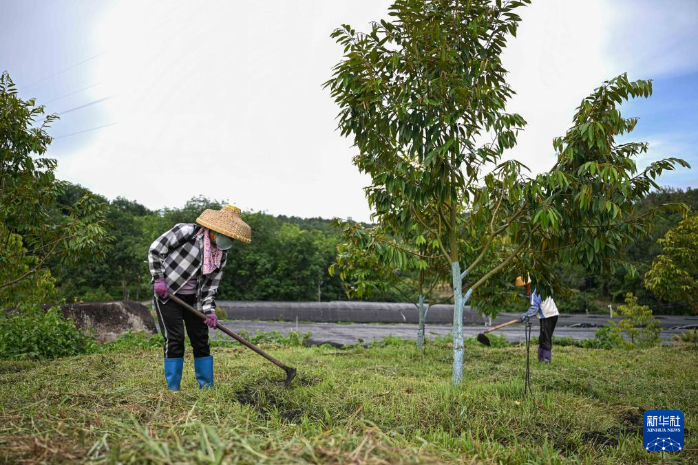 5月24日,农民在保亭优旗潘坡榴莲生态产业园为榴莲树施肥。新华社记者 蒲晓旭 摄