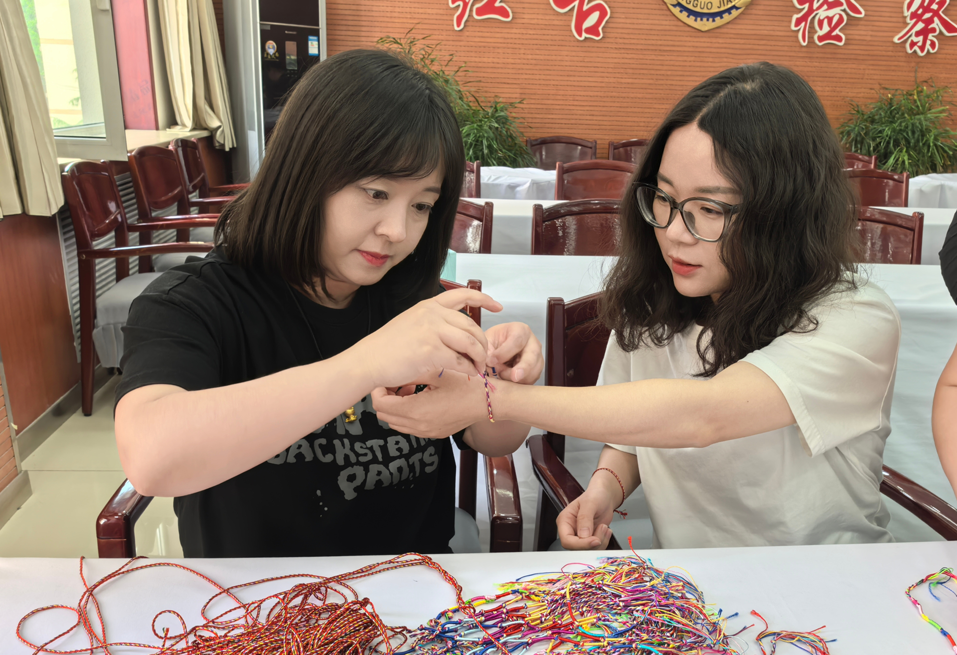 粽叶清香弥漫会场,最热闹的包粽子环节点燃全员热情,有经验的干警手法娴熟,折叶、填米、压实、捆绳,一气呵成,年轻干警围在一旁虚心求教,指尖虽略显生涩,却饱含专注;其他干警则将一根根五彩花绳编织成祈福的纽带,串联节日欢乐。众人围坐一桌,笑谈南北粽子的甜咸之争。指尖流转的是千年技艺,彩绳缠绕的是严谨法理,笑语传递的是检察温情。