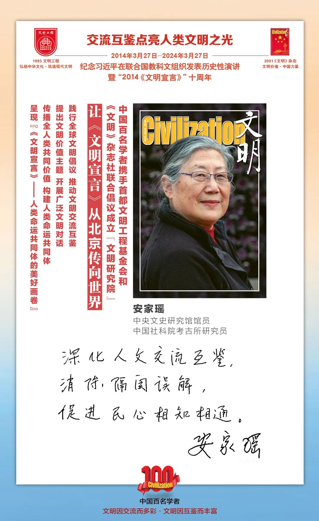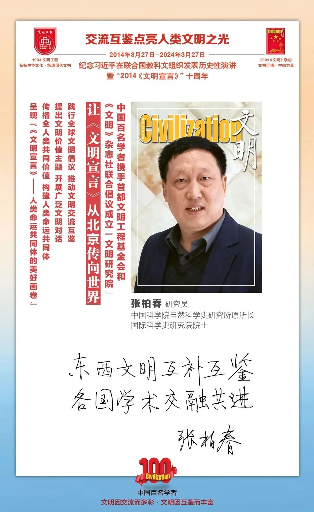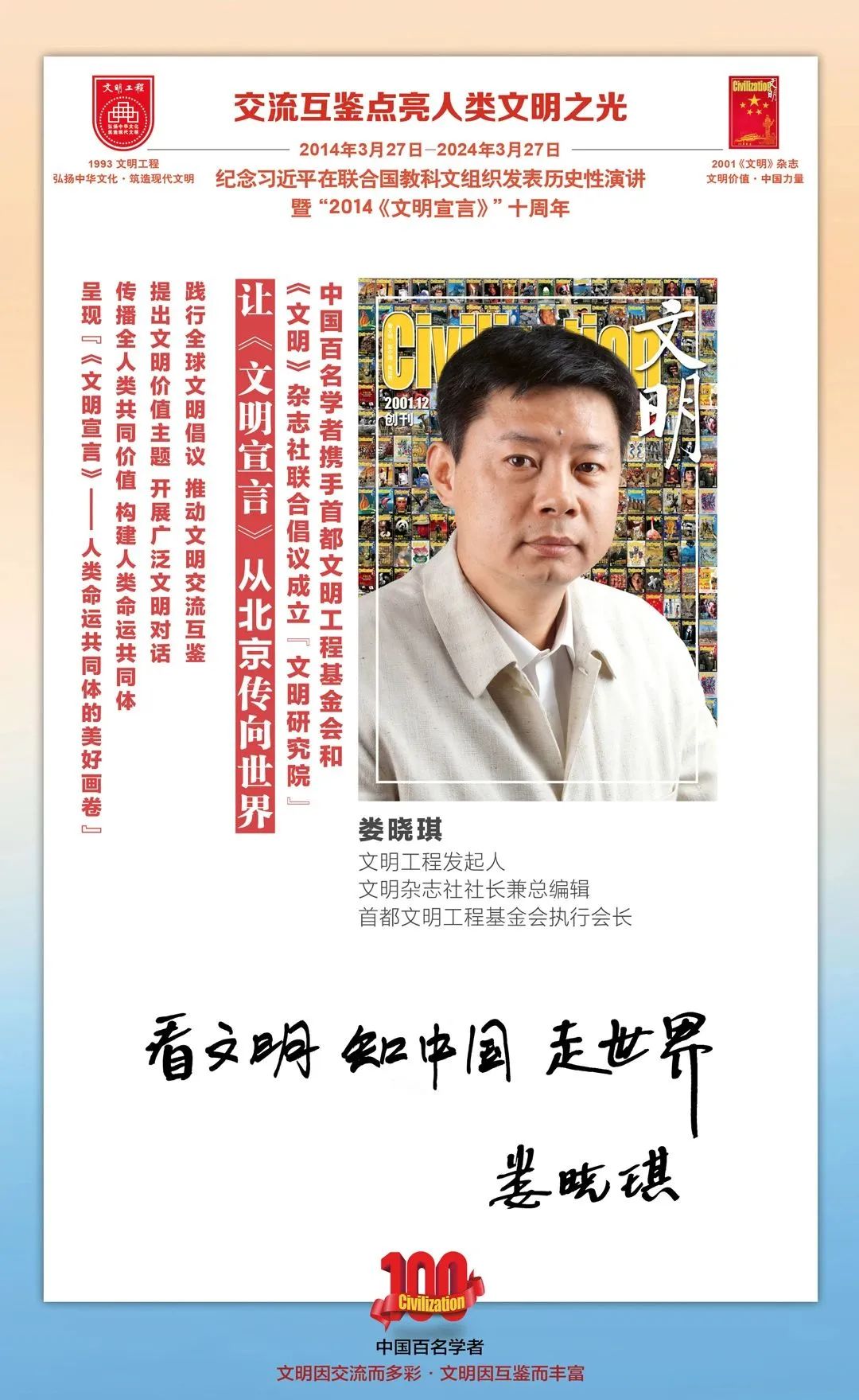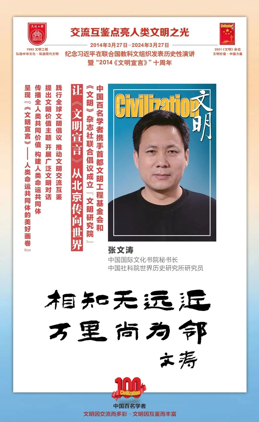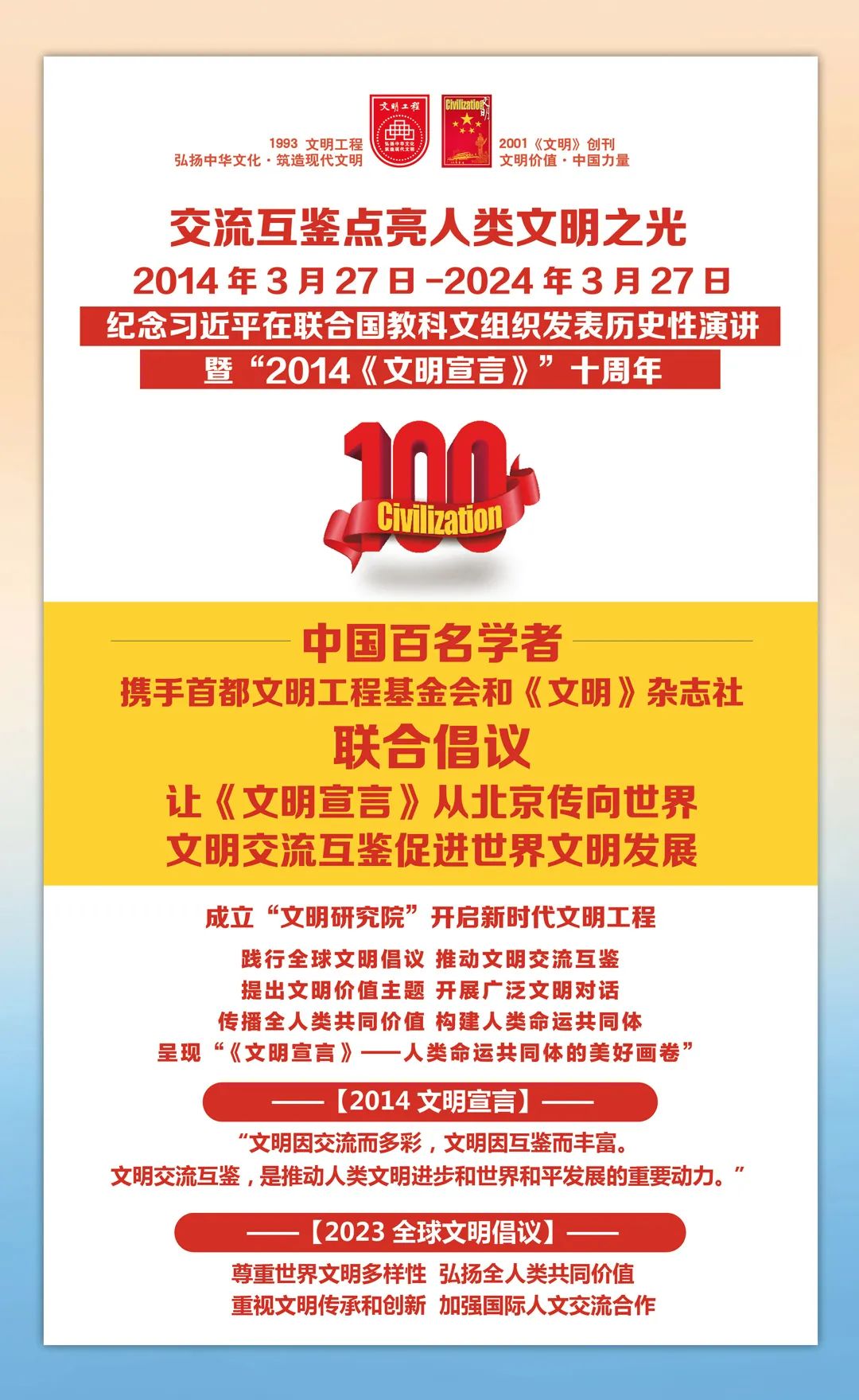 2014-2024,纪念2014《文明宣言》发表10周年,中国百名学者携手首都文明工程基金会和《文明》杂志社联合倡议。让《文明宣言》从北京传向世界,文明交流互鉴促进世界文明发展。